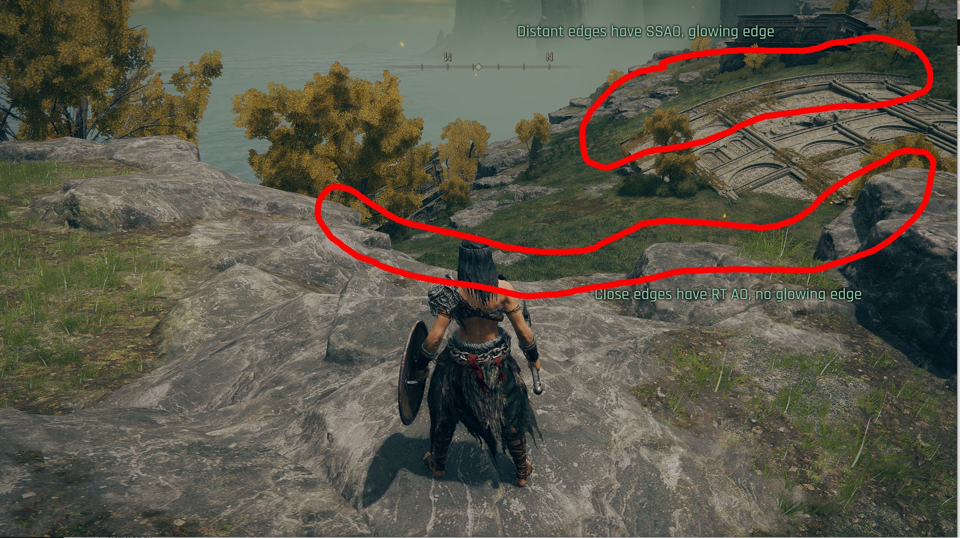 最初の画像: レイ トレーシング オフ。 2 番目の画像: レイ トレーシングがオン。 3 番目の画像は、RTAO が崖/岩の端の近くの領域のグローをどのように除去するかを示しています (ただし、遠い領域ではありません)。基本的に、それは非常に小さな違いです。